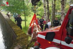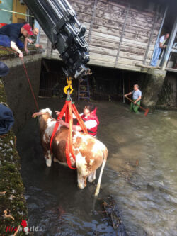 Nachdem die Schwimmerin umgehend gesichert wurde, wurde der Mühlbach daraufhin vom Verwalter der E-Werke abgelassen, um das Tier nicht nach ihren zwei Tauchgängen – schon beim Flutereingang hat sie durchtauchen müssen – und ihrer langen Schwimmstrecke nicht noch mehr zu fordern und die Rettungsaktion zu erleichtern. Wie schon 2014 wurde auch diese Kuh schließlich mit dem Kran der FF Hohenberg aus ihrer nassen Lage befreit.