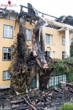 ALTMÜNSTER (OÖ): Der Großbrand in Schloss Ebenzweier in Altmünster (Bezirk Gmunden) war Dienstagfrüh, 10. Mai 2016, weitgehend gelöscht. „Brand aus“ konnte aber wegen Glutnestern noch nicht gegeben werden. Laut Feuerwehr sind 90 Prozent des Dachstuhls zerstört.
