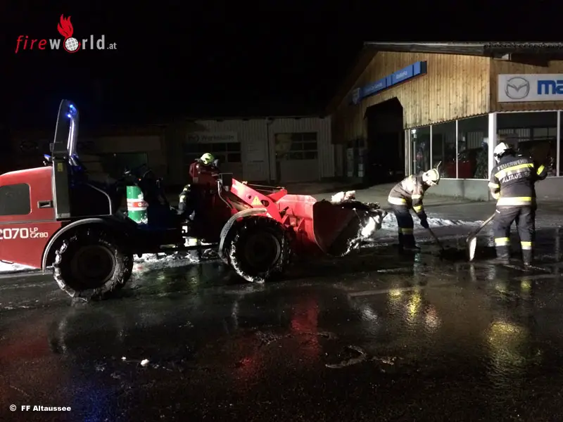 Beim Eintreffen der ersten Einsatzkräfte der FF Bad Aussee stand der Klein-Lkw bereits in Vollbrand. Da bereits Betriebsmittel ausgelaufen sind, wurde unverzüglich ein Schaumangriff unter schwerem Atemschutz durchgeführt. Durch ein geladenes Ölfäss, welches komplett von den Flammen umschlossen war, wurden die Löscharbeiten zusätzlich erschwert. Der größte Teil der Ladung konnte jedoch vom Fahrer noch gerettet werden bevor ein Betreten der Ladefläche unmöglich wurde.