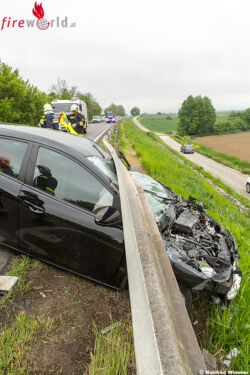 LANGENLOIS (NÖ): Riesenglück hatte eine Fahrzeuglenkerin am späten Nachmittag des 12. Mai 2016 auf der B218 zwischen Krems und Langenlois. Kurz nach der Mülldeponie prallte sie aus unbekannter Ursache gegen die Leitschiene. Dabei wurde das Fahrzeug unter die Leitschiene gedrückt und im Frontbereich schwer beschädigt.