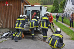 Verletzt wurde bei diesem Unfall glücklicherweise niemand. Die alarmierte FF Gloggnitz Stadt zog den Kleinbus mittels Seilwinde aus der Holzhüttenverschallung. Da sich im Kleinbus ein Motorrad befand, und unklar war ob durch den Zusammenstoß Betriebsmittel auslaufen, musste die Hecktüre mittels hydraulischen Spreitzer geöffnet werden. Nach rund einer Stunde konnte der Einsatz beendet werden.