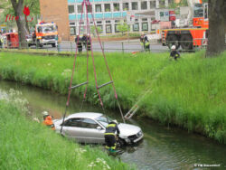 DÜSSELDORF (DEUTSCHLAND): Aus bisher ungeklärter Ursache fuhr am Sonntagvormittag, 15. Mai 2016, ein 88-Jähriger seinen Audi bei einem Ausparkmanöver an der Heinrichstraße in den Kittelbach.