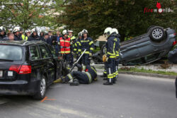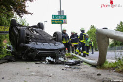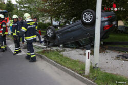 Laut ersten Informationen kollidierten zwei Pkw. Eines der Unfallfahrzeuge überschlug sich bei dem Zusammenstoß und kam am Dach zum Liegen. Feuerwehr, Rettungsdienst und Polizei standen im Einsatz. Entgegen ersten Annahmen war niemand im Fahrzeug eingeklemmt oder eingeschlossen. Die Feuerwehr stellte das Fahrzeug wieder auf die Räder und unterstützte das Abschleppunternehmen bei den Aufräumarbeiten. Eine umgefahrene Straßenlaterne wurde von der Feuerwehr entfernt. Ausgelaufene Betriebsmittel wurden gebunden. Die Leondinger Straße war im Bereich der Unfallstelle rund eine Stunde für den Verkehr gesperrt.