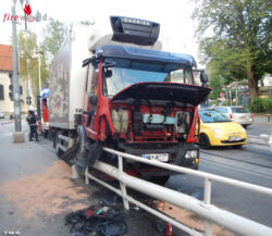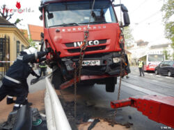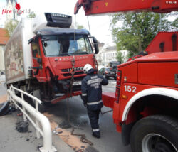 Von den Einsatzkräften der Berufsfeuerwehr Wien wurde der Lkw gesichert und anschließend mit dem Kranarm des Abschleppfahrzeuges von der Gehsteigbegrenzung heruntergehoben. Danach konnte das Fahrzeug entfernt und die Fahrbahn gereinigt werden. Der Lkw-Fahrer wurde leicht verletzt.