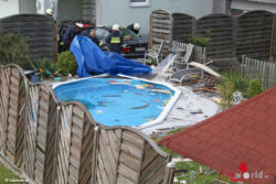 KRENGLBACH (OÖ): Ein spektakulärer Unfall ereignete sich Mittwochmittag, 18. Mai 2016, in Krenglbach (Bezirk Wels-Land). Ein Autolenker durchbrach mehrere Gartenzäune, fuhr durch einen Gartenpavillon und sprang mit dem Pkw über ein Schwimmbecken.