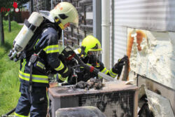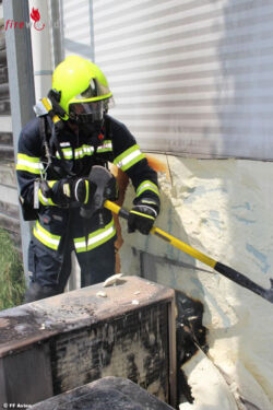 Einsatzmaßnahmen: Der von Passanten mit Pulverlöschern bereits eingedämmte Brand wurde mittels Hochdruckrohr abgelöscht. Aufgrund der weiterhin vorherrschenden Rauchentwicklung wurde von einem Atemschutztrupp die Blechverkleidung des Gebäudes mit einem Trennschleifer aufgeschnitten. Des Weiteren wurde die Isolierschicht entfernt. Der Brandverlauf wurde laufend mit einer Wärmebildkamera kontrolliert. Von der Feuerwehr wurde der gesamte Bereich stromlos geschaltet, der Verkaufsbereich wurde für den Kundenverkehr gesperrt.