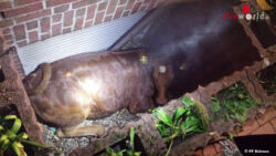 DÜLMEN (DEUTSCHLAND): Am 21. 5. 2016, um 02.13 Uhr wurde der Löschzug Merfeld und die Hauptamtliche Wache zur Karl-Leisner-Straße im Ortsteil Merfeld alarmiert, dort hatte sich ein Rind in einen Garten eines Einfamilienhauses verirrt und fiel dort in einen Lichtschacht.