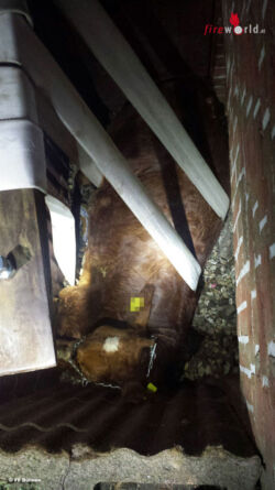 Nach dem Eintreffen wurde sofort ein Tierarzt verständigt, der das Rind im weiteren Einsatzverlauf betäubte. Um das leicht verletzte Tier aus dem Lichtschacht zu heben, wurde ein Gabelstapler angefordert und dann B-Schläuche um das Rind gewickelt, an denen es dann aus dem Schacht gerettet wurde. Wie das Tier überhaupt in den Garten kommen konnte, ist noch nicht geklärt.