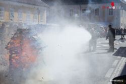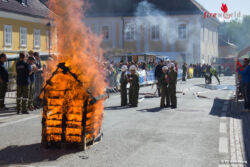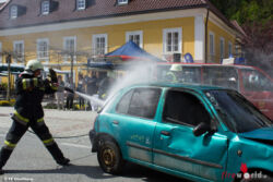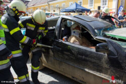 Um 15.30 Uhr folgte das Highlight des Tages: Eine Verkehrsunfallübung der FF – Straßburg und dem Roten Kreuz. Auf dem Hauptplatz kollidierten zwei PKW einen stehenden LKW. Ein Fahrzeug begann zu brennen und im Zweiten wurden zwei Personen eingeschlossen. Mittels Hochdrucklöschgerät des MTF-A wurde der Fahrzeugbrand bekämpft. Dabei konnte die Wirksamkeit dieses Gerätes der Bevölkerung vorgeführt werden. Die verletzten Personen wurden mittels hydraulischen Rettungsgeräts und in Absprache mit dem Roten Kreuz aus dem Wrack befreit. Der Lenker wurde nach der Türöffnung gerettet. Für eine schonende Rettung des zweiten Verletzten wurde das Dach des Fahrzeuges entfernt und eine Bergung mittels Bergebrett vorgenommen.