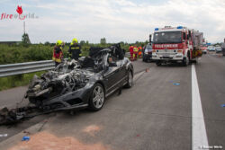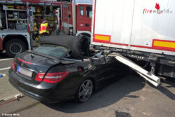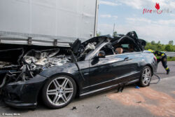 TRIBUSWINKEL (NÖ): In den Nachmittagsstunden des 18. Mai 2016 kam es auf der A2 Südautobahn zwischen Baden und Traiskirchen in Richtung Wien zu einem folgenschweren Verkehrsunfall. Aus bislang ungeklärter Ursache prallte ein Cabrio mit hoher Geschwindigkeit in das Heck eines mit 20 Tonnen Mineralwasser beladenen Sattelkraftfahrzeugzug. Der Pkw schob sich durch die Wucht des Aufpralls bis zur hintersten Achse des Aufliegers.