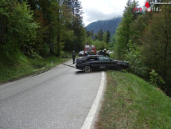 BAD AUSSEE (STMK): Ein mit vier Jugendlichen besetzter Pkw kam im Koppental am 17. Mai 2016 gegen 14h von der Straße ab und flog über die steil abfallende Böschung in den angrenzenden Wald ,wo der Unfallwagen völlig demoliert am Dach zum Stillstand kam.