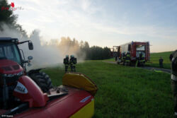 Am Einsatzort war folgende Übungsannahme: Im Zuge von Erntearbeiten ist ein mit Heu beladener Ladewaren in Brand geraten. Das Heu wurde von Fahrer über eine Strecke von 200 Metern teilweise abgeladen. Teile des in Brand geratenen Heus verursachten im angrenzenden Wald einen Folgebrand. Als zusätzliche Herausforderung stellte sich sicher auch das starke Gefälle am Waldrand dar. Erstmals bei einer Pflichtbereichsübung wurden Raucherzeuger eingesetzt, welche die Annahme der Übung verdeutlichten.
