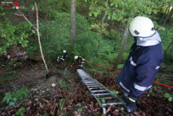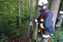 Unter schwerem Atemschutz wurde nach Eintreffen der ersten Feuerwehr mit der Brandbekämpfung begonnen um ein weiteres Ausbreiten zu verhindern. Zeitgleich wurde mit dem Aufbau einer Wasserversorgung zum Übungsort begonnen. Die nachrückenden Feuerwehren unterstützen die Kräfte am Übungsort und führten die Brandbekämpfung mit Hilfe von Absturzsicherungen im Wald durch. Im Zuge dieser Löscharbeiten kam es zu einer weiteren Übungsannahme, ein Feuerwehrmann stürzt über das Gefälle ab.