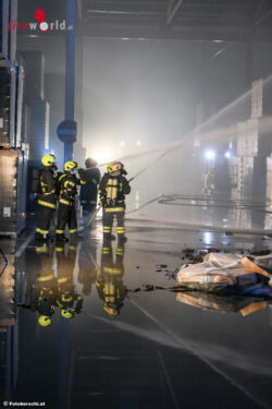 Zum Zeitpunkt wo die Wasserversorgung noch aufgebaut war, war die oberste Priorität, das Schützen der angrenzenden Güter und ein Übergreifen auf das Hallendach zu verhindern. Die Wasserversorgung wurde mit vier Tragkraftspritzen vom Schlossteich mit einer Gesamtförderleitung von ca. 4800l/min durchgeführt. Aufgrund der sehr großen Rauchentwicklung konnten die Löscharbeiten nur durch Atemschutztrupps durchgeführt werden. Um das Ausbreiten des Brandes zu verhindern, wurden mit Staplern Paletten entfernt, um Schneisen zu erhalten, von denen aus der Brand gehalten und besser bekämpft werden konnte.