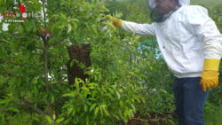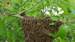 Der Bienenschwarm hat sich innerhalb von Minuten auf einem Baum niedergelassen. Der Imker der Freiwilligen Feuerwehr Lacken besprühte die Bienen zur Beruhigung mit Wasser und konnte diese in einen mitgebrachten Bienenstock übersiedeln. Nach einer Stunde war die Übersiedelung abgeschlossen und die Kinder konnten wieder sorglos im Garten spielen.