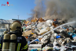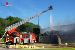 Die Drehleiter der FF Attnang war zu diesem Einsatz perfekt und konnte das Feuer von oben bekämpfen. Mit Radladern wurde der Müllhaufen auseinandergeräumt und von den Feuerwehren das brennende Material abgelöscht.