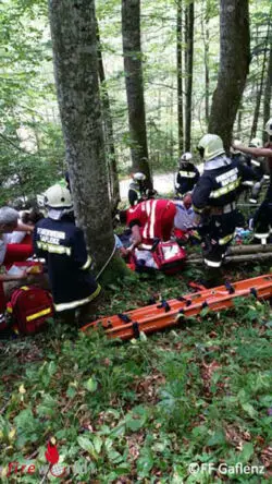 Von den darauf ankommenden drei Notärzten samt Teams wurde die Person medizinisch versorgt. Danach erfolgte die Personenrettung mittels Schaufeltrage. Aufgrund der Steilheit des Geländes wurde eine Menschenkette gebildet um die Person so schonend nach unten auf eine Forststraße zu transportieren sowie anschließend zum Notarzthubschrauber zu tragen.