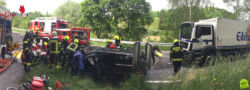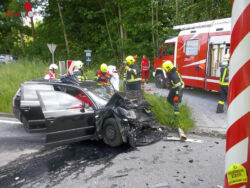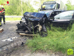 Ein Pkw war frontal mit einem Lkw kollidiert. Die Autofahrerin befand sich noch im Fahrzeug war jedoch nicht eingeklemmt, NEF und Rotes Kreuz sowie die Polizei vor Ort. Nach Absprache mit dem Notarzt wurde die Frau mit dem Spineboard über die hintere Seitentüre gerettet. Zeitgleich wurde der Brandschutz aufgebaut und auslaufende Betriebsstoffe gebunden. Nach Freigabe der Polizei wurde der Pkw von einer Firma geborgen, der LKW wurden im Auftrag einer Firma in die Werkstätte am Tabor geschleppt.