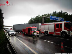 Der Sattelzug knickte danach ein und prallte gegen die Mittelleitschiene. Beide Lenker hatten großes Glück und blieben unverletzt, an beiden Sattelzügen entstand jedoch erheblicher Sachschaden. Wenige Minuten nach der Alarmierung trafen die alarmierten Feuerwehren Nestelbach bei Graz, Ludersdorf und Gleisdorf auf der Unfallstelle ein. Der Einsatzleiter der Feuerwehr Nestelbach bei Graz erkundete sofort die Lage am Unfallort, zeitgleich führte die Mannschaft bereits eine großräumige Absicherung der Unfallstelle durch.
