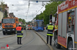 MÜNCHEN (BAYERN): Eine Stunde benötigte die Feuerwehr München für das Eingleisen einer Trambahn, die zwischen Romanplatz und Südlicher Auffahrtsallee mit einem Rad aus den Schienen geraten war.