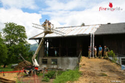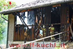 KUCHL (SBG): Nach Strohschneidearbeiten bricht am 3. Juni 2016 gegen 10.00 Uhr in einem landwirtschaftlichen Objekt im Kuchler Ortsteil Garnei ein Brand aus. Die grauschwarze Rauchsäule ist weithin sichtbar und durch die berstenden Eternitschindeln werden viele Nachbarn auf den Brand aufmerksam und eilen zur Hilfe, um die Kühe aus dem Stall zu retten.