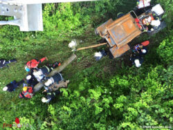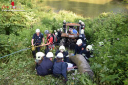 Übungsannahme war, dass ein Traktor bei Mäharbeiten über die Ybbslände rutschte, dabei einen Baum mit sich riss und der Traktorfahrer sowie sein Mitarbeiter verletzt wurden. Beim Eintreffen der ersten Rettungskräfte wurde unverzüglich mit der Erkundung durch den Einsatzleiter der Feuerwehr und der Bergrettung begonnen!