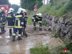 Wie schon vergangenen Samstag waren die Landesstraßen L6208 und L6225 am stärksten betroffen. Auf der L6208 wurde die Straße auf mehreren Stellen von Schlamm Geröll vermurt. Hierfür wurde der Teleskoplader der FF Ulmerfeld-Hausmening zur Unterstützung angefordert.