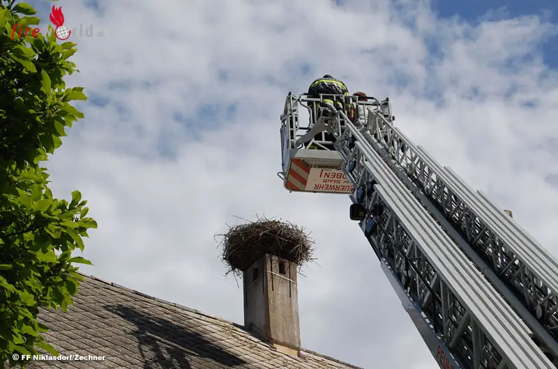 NIKLASDORF (STMK): Die Freiwillige Feuerwehr Niklasdorf im Bezirk Leoben/Steiermark wurde am 05.06.2016 um 09:20 Uhr zu einer Tierrettung in Niklasdorf alarmiert, bei der zwei Storchenküken sowie ein weiteres Storchenei aus einem Nest gerettet werden mussten.