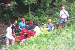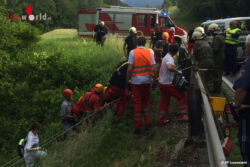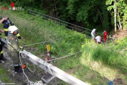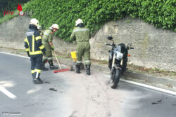 Unfallstelle 1: Ein Motorradlenker verlor in einer Linkskurve die Herrschaft über sein Fahrzeug und prallte gegen eine Leitschiene. Der Lenker wurde in weiterer Folge über eine steile Böschung geschleudert, wo er sich in einem Geländer verfing. Beim Eintreffen am Einsatzort wurde ein völlig demoliertes Motorrad vorgefunden, woraus eine größere Menge an Betriebsmittel ausfloss. Die verletzte Person wurde nach der Erstversorgung durch den Notarzt gemeinsam mit der Bergrettung aus dem Straßengraben gerettet und dem Team des Christophorus Notarzthubschraubers übergeben. Das ausgeflossene Betriebsmittel wurde gebunden sowie die Straße gesäubert.