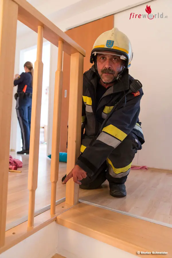 OBERWALTERSDORF (NÖ): In den Nachmittagsstunden des 9.Juni 2016 steckte ein zweijähriger Bub mit dem Hals zwischen Sprossen eines Holzgeländers im Obergeschoß eines Wohnhauses fest. Da der Familienvater nicht selber seinen Buben befreien konnte, wählte dieser den Feuerwehr Notruf 122 und bat um Hilfe.