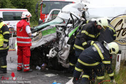 HARGELSBERG (OÖ): Am Vormittag des 9. Juni 2016 wurde die Feuerwehr Enns – gemeinsam mit der Feuerwehr Hargelsberg – um 8:28 Uhr zu einem schweren Verkehrsunfall auf der B309 alarmiert. Zwei Kleintransporter waren frontal zusammengestoßen. Beide Lenker waren schwerverletzt in ihren Fahrzeugen eingeklemmt.