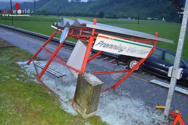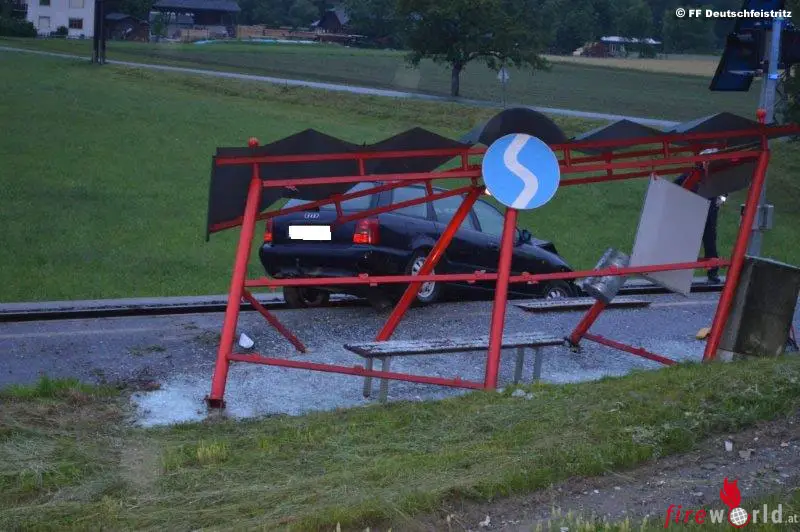 DEUTSCHFEISTRITZ (STMK): Die Landesleitzentrale Steiermark alarmierte die Feuerwehr Deutschfeistritz am 10.06.2016 um 04:49 Uhr zu einem Verkehrsunfall im Ortsteil Prenning. Ein Plw war von der Straße abgekommen und rammte nach ca. 100 Meter ein Wartehäuschen der Steiermärkischen Landesbahn (STLB) , danach kam er auf der Gleisanlage zum Liegen.