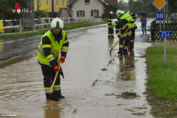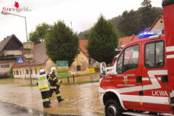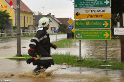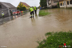 In Gniebing (Gde. Feldbach, Bez. Südoststeiermark) hieß es auf der B68 kurzfristig „Land unter“. Hier schossen die Wassermassen im wahrsten Sinne des Wortes von Gniebing-Berg die Straße hinab direkt auf die Bundesstraße – und setzten einen Kreuzungsbereich im Ortszentrum innerhalb kürzester Zeit knietief unter Wasser. An der Einsatzstelle musste temporär eine lokale Umleitung eingerichtet werden. Ebenso am Einsatzort: Polizei und Straßenerhaltungsdienst.