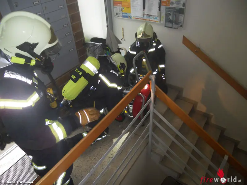 Beim Eintreffen der Einsatzkräfte drang bereits Rauch aus dem Mehrparteienwohnhaus. Unverzüglich begab sich ein Trupp unter Atemschutz mit einem C-Rohr in den Keller. Das betroffene Kellerabteil konnte rasch lokalisiert werden und somit der Brand schnell abgelöscht werden. Um den Rauch aus dem Wohnhaus zu bekommen, wurde das Be- und Entlüftungsgerät vom schweren Rüstfahrzeug in Stellung gebracht. Weiters wurde ein Hochleistungslüfter im Stiegenhaus aufgestellt.