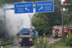 MÖNCHENGLADBACH (DEUTSCHLAND): Aus bisher unbekannter Ursache kam es in der Tangente von der BAB 61 Fahrtrichtung Koblenz auf die BAB 52 Fahrtrichtung Düsseldorf am 13. Juni 2016 zum Brand im Motorraum eines 40 Tonnen Autokrans. Auf der Anfahrt war bereits eine große schwarze Rauchsäule sichtbar. Der Fahrer blieb unverletzt.