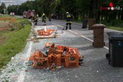 Es kam zur Kollision mit einem zweiten Lkw, der mit Leergebinde beladen war. Bei dem Unfall wurde die Seitenwand des Fahrzeugs aufgerissen. Etliche Flaschen und Kisten fielen über rund 100 Meter verteilt auf die Fahrbahn.
