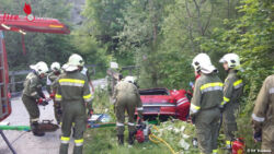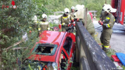 - zweiter Pkw drohte in Bach zu stürzen, 2 Personen eingeklemmt