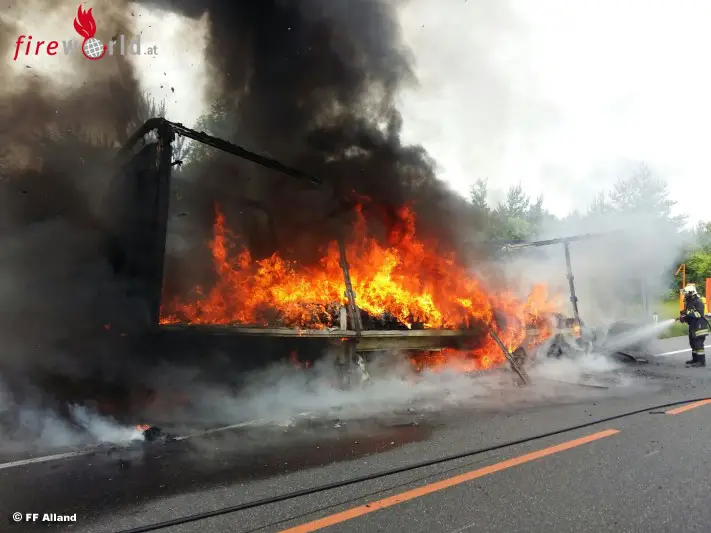 Gegen 09:40 Uhr wurden die laut Autobahnalarmplan zuständige Freiwillige Feuerwehr Alland und Heiligenkreuz über die Feuerwehrbezirksalarmzentrale Baden alarmiert. Als das erste Tanklöschfahrzeug der FF Alland an der Einsatzstelle eintraf, stand der bereits abgekoppelte Auflieger, beladen mit Materialien für eine Handelskette (diverse Handelsartikel und Elektronikgeräte) in Vollbrand.