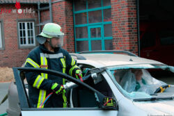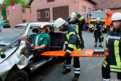 Danach wurde eine Methode geübt, die in den Skandinavischen Ländern vielfach Anwendung findet. Die sogenannte „Oslo-Methode“. Hierbei wurde der verunfallte Pkw auf die Straße gezogen und am Heck durch Anschlagen an ein Feuerwehrfahrzeug gesichert. Anschließend wurden die beiden vorderen Fahrzeugsäulen (A-Säule) an die Seilwinde des HLF angeschlagen und Entlastungsschnitte im unteren Bereich der A-Säulen durchgeführt. Durch das Anziehen mit der Seilwinde konnte so sehr schnell eine große Befreiungsöffnung zur Entklemmung des schwer eingeklemmten Fahrers erreicht werden.