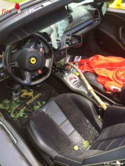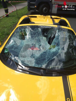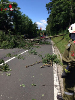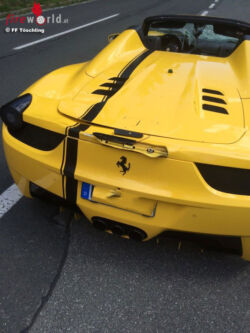 Ein umstürzender Baum war zuvor auf einen Ferrari gefallen und hatte diesen unter sich begraben. Verletzt wurde dabei niemand. 13 Mann der Wehr legten das Auto wieder frei und räumten den Baum weg.