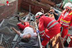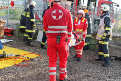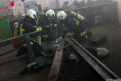 Während sich ein Atemschutztrupp in das Halleninnere aufmachte um mit der Personenrettung zu beginnen, wurde von der Besatzung des Löschfahrzeuges in enger Zusammenarbeit mit den Kräften des Rettungsdienstes der – im Alteisencontainer – gepfählte Mitarbeiter stabilisiert, transportfähig gemacht und zu weiteren Versorgung zum Verletztenablageplatz gebracht.