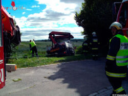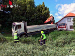 Ein ortsansässiger Landwirt sicherte mit seinem Traktor bis zum Eintreffen der Feuerwehr das Fahrzeug vor weiterem Abrutschen. Helmut Neubauer, der Einsatzleiter der FF Kleinhöflein, entschied angesichts des Gewichtes des Lkws von rund 18 Tonnen, die FF Retz anzufordern.