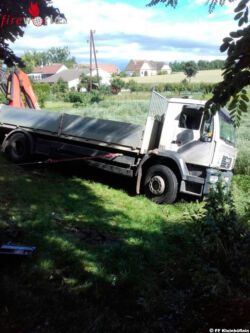 KLEINHÖFLEIN (NÖ): Am 17. Juni 2016 um 8.55 Uhr wurde die Feuerwehr Kleinhöflein zu einer Lkw-Bergung alarmiert. Ein mit Grabsteinen beladener Lkw war bei der Zufahrt zum Friedhof in Kleinhöflein abgerutscht und konnte sich aufgrund des aufgeweichten Bodens nicht aus eigener Kraft befreien.