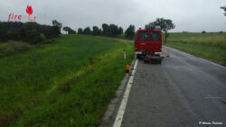 Eine Fahrzeuglenkerin kam mit ihrem Hyundai von der regennassen Fahrbahn ab und mit ihrem schwer beschädigten Fahrzeug in einem Feld zu stehen. Zwei Kameraden der FF Gainfarn kamen mit ihrem Versorgungsfahrzeug zufällig als erste an der Unfallstelle vorbei, führten erste Absicherungsmaßnahmen durch, veranlassten die Alarmierung der FF St. Veit/Tr. und kümmerten sich um die leicht verletzte Lenkerin.