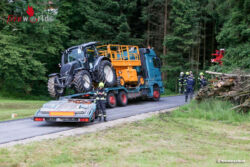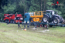 Ein LKW samt Anhänger beladen mit zwei großen Traktoren und einer Arbeitsbühne fuhr trotz Hinweistafeln und einer 7,5 to Beschränkung die Straße bergwärts. An der steilsten Stelle gab es kein Weiterkommen mehr und beim retour schieben kam der LKW aufs Bankett und blieb in gefährlicher Schräglage stecken. Der Dieseltank wurde bei diesem Manöver beschädigt und Diesel floss aus. Der LKW wurde an der 20 to Seilwinde des Kranfahrzeuges angeschlagen, mit der Seilwinde des Rüstfahrzeuges wurde der LKW seitlich gesichert.