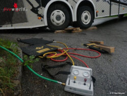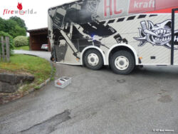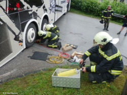 Da dies eine recht steil anfallende Hauseinfahrt war, saß der Reisebus mit dem Heck auf der Zufahrt fest und konnte weder vor noch zurück! Von der alarmierten FF Bad Aussee wurde der Bus mittels Hebekissen angehoben und ein hölzerner Unterbau errichtet, wobei der Reisebus aus seiner misslichen Lage befreit werden konnte. Somit konnte der Reisebus mit den selbst zugefügten Schäden seine Reise weiter fortführen.
