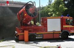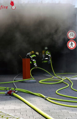 Die starke Rauchentwicklung aus der Tiefgarage einer Schule an der Friedenspromenade zeigte den anfahrenden Einsatzkräften bereits von weitem den Weg. Da die Schule bereits durch die ausgelöste Brandmeldeanlage vorbildlich von den Lehrkräften geräumt wurde, konnten sich die ersten Feuerwehrbeamten auf die Löscharbeiten in der Tiefgarage konzentrieren.