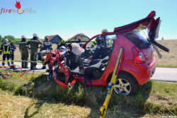 Aus bislang unbekannter Ursache waren die zwei Autos ineinander gerast und beide Lenker in ihren Fahrzeugen eingeklemmt. Während die Kameraden der Feuerwehr Raab sich um die eingeklemmte Riedauerin kümmerten, befreiten wir mit den Kameraden der Feuerwehr Schulleredt den aus Taufkirchen stammenden Fahrzeuglenker, der massivst in seinem Pkw gefangen war.