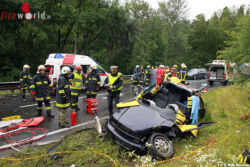 Beim Eintreffen der Feuerwehr wurden die verletzten Personen bereits von Sanitätern des Roten Kreuzes und dem Notarzt des Rettungshubschraubers Christophorus 10 betreut. Von den Feuerwehren wurde umgehend mit den Rettungsarbeiten begonnen. Um die verletzte Lenkerin schonend zu retten wurde mit hydraulischen Rettungsgeräten das Dach des Fahrzeuges abgetrennt und anschließend die Fahrertür entfernt.