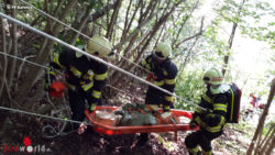 Nach der Lageerkundung seilten sich mehrere Einsatzkräfte mit einer Korbtrage und der ersten Hilfe Ausrüstung zur verletzten Person ab. Parallel dazu wurde durch eine andere Gruppe das Feuerwehrrettungsboot bei der Slippstelle beim Kraftwerk zu Wasser gebracht. Danach begab man sich mit dem Boot zur angegebenen Einsatzstelle.